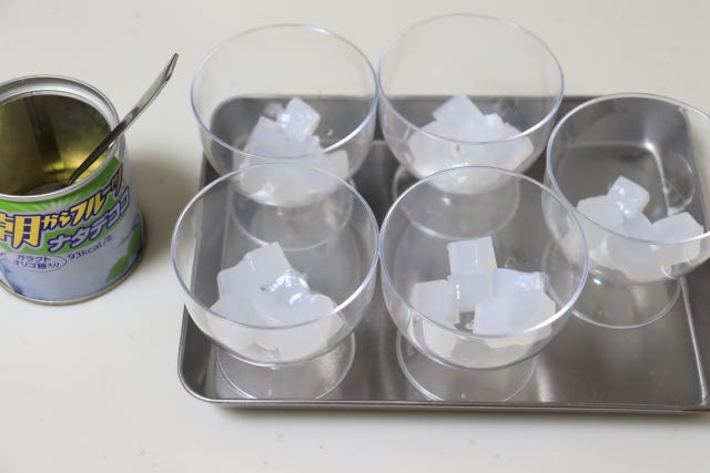 ナタデココのシロップを切り、カップに6~7個入れる。※今回は5カップ分で作っているので5等分にして使い切っています。
