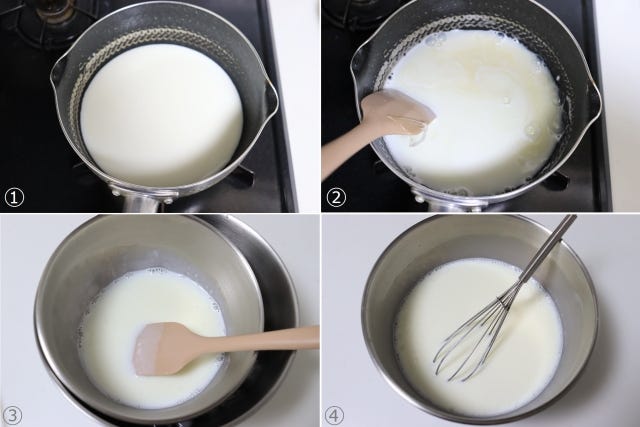 ① 鍋に牛乳とグラニュー糖を入れて中火にかける。