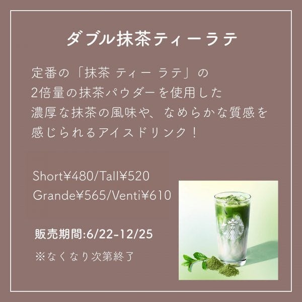 定番の「抹茶ティーラテ」の2倍量の抹茶パウダーを使用したアイスドリンク。