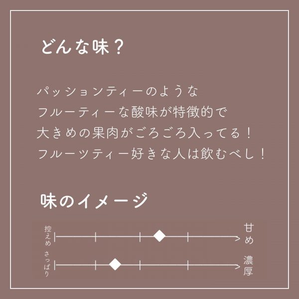 パッションティーのようなフルーティーな酸味が特徴的で、大きめの果肉がごろごろ入っています。