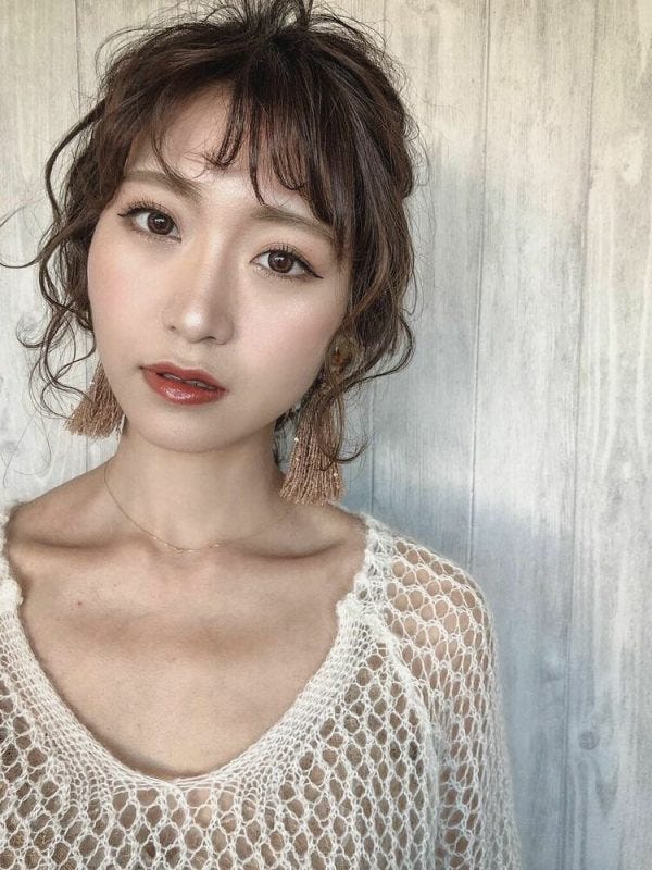 コテを使ってくるくるふわふわに巻いたキュートなショートヘアには、前髪もくせ毛風にアレンジしてみましょう。