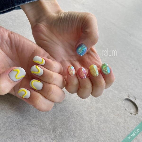 イエローやブルーなど指ごとに色を変えてカラフルに彩ったら、オーロラをプラスしてうるうるな氷ネイルに。もう片方の爪はマット×ラインアートの全く違うデザインにして、とにかくポップで気分が上がるデザインにしちゃいます♡まるでかき氷な色合いにテンションも最高潮♩