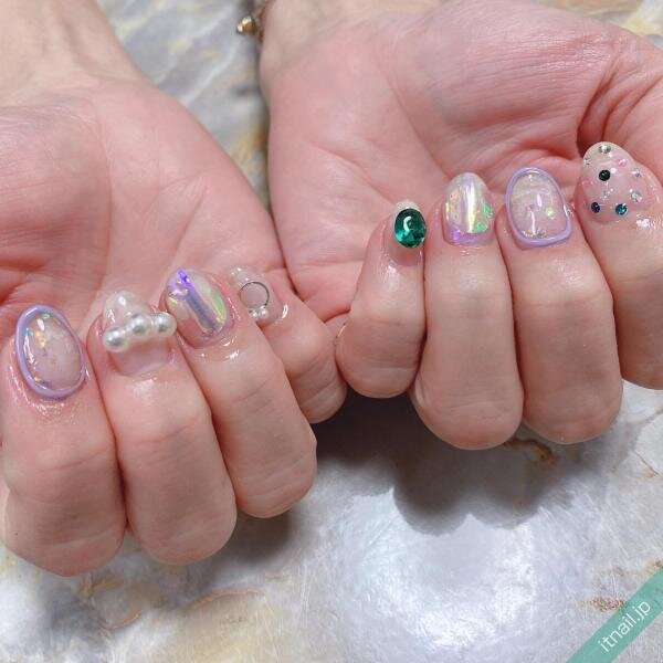 涼しげな氷ネイルの上に、爪いっぱいの大きさのハートやクマのモチーフを乗せて”ゆめかわいい”世界観を演出して。大きめのパーツですが、ネイルの色と同じ色なので、統一感はばっちり。「それどこでやったの?」とつっこまれ待ちなお目立ちネイルデザインです。