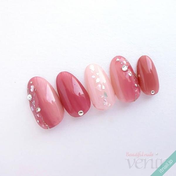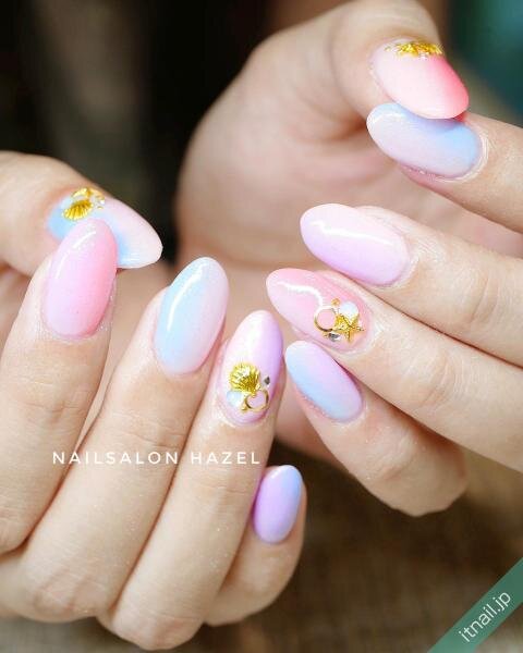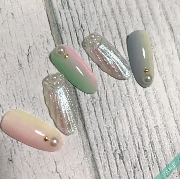 可愛らしいピンク系の縦グラデーションネイルは、デートにぴったりなデザインです。夏は、涼しげなシェルやストーンをのせて、華やかでキラキラした指先にするのがおすすめ♡流れるように入れたラメラインも大人っぽくて素敵です。