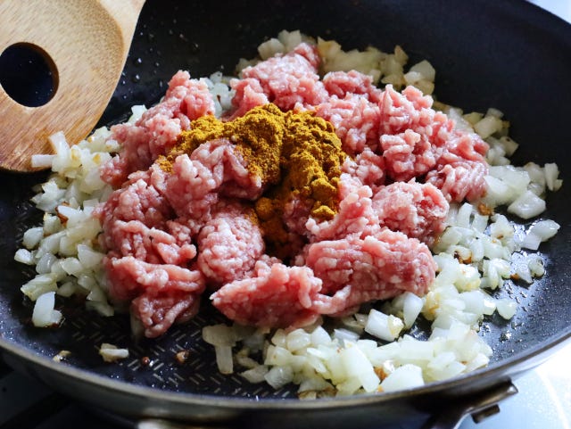 ② しんなりするまで炒めたら、ひき肉とカレー粉を入れる。