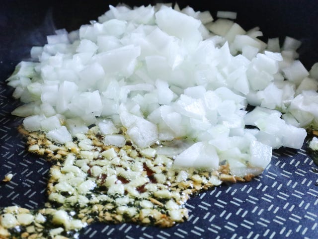 ① フライパンにオリーブオイルをひき、みじん切りにしたにんにくと粗みじん切りにした玉ねぎを入れて火を点ける。