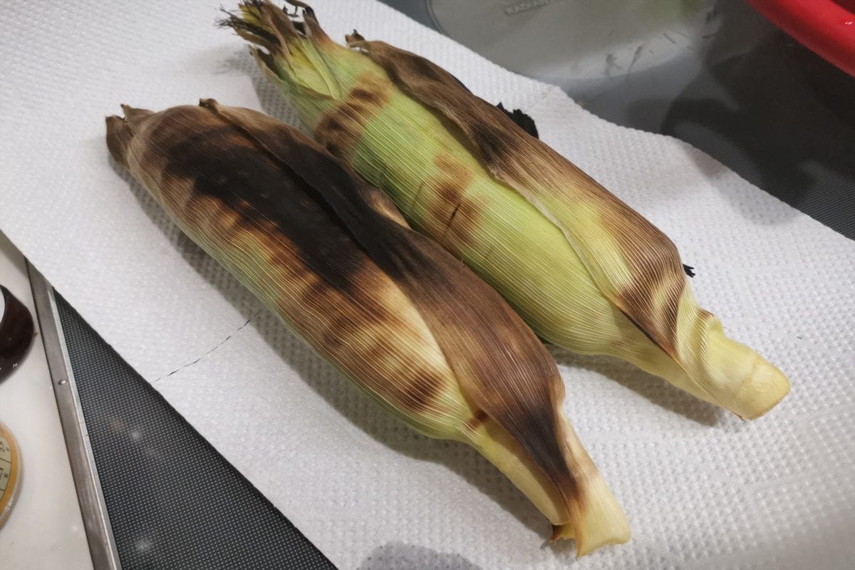 そうすると皮が焦げるので、アツアツの状態からキッチンペーパーなどを下に敷いて少しの間冷まし、皮を剥けば調理成功。こうすることでとうもろこしの実が蒸された状態になり、甘さも上がるのだ。