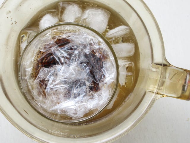 ⑥ 氷水を入れた容器にグラスごと入れ、冷蔵庫で冷やし固めます。