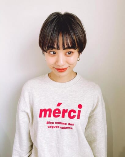 コンパクトでコロンとしたシルエットに仕上がるので、ハンサムショートらしい魅力を残しつつ、ショートボブにも近い雰囲気に。スッキリ見えの中にもガーリーな雰囲気を醸せます。また、長めの前髪は少しカールさせて流すとイマドキ感がアップ。サイドを耳かけして、シルエットをよりコンパクトに見せるのもおすすめです。