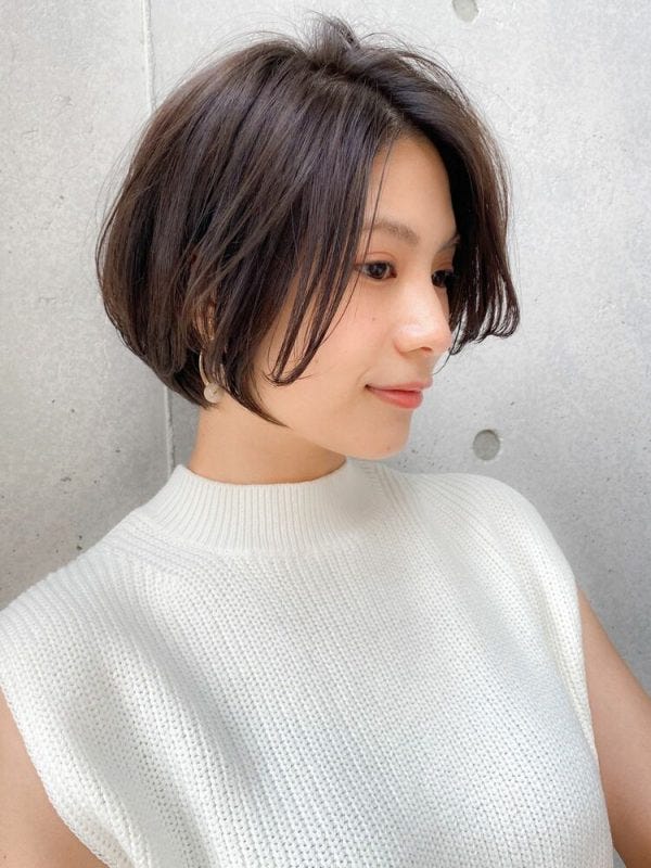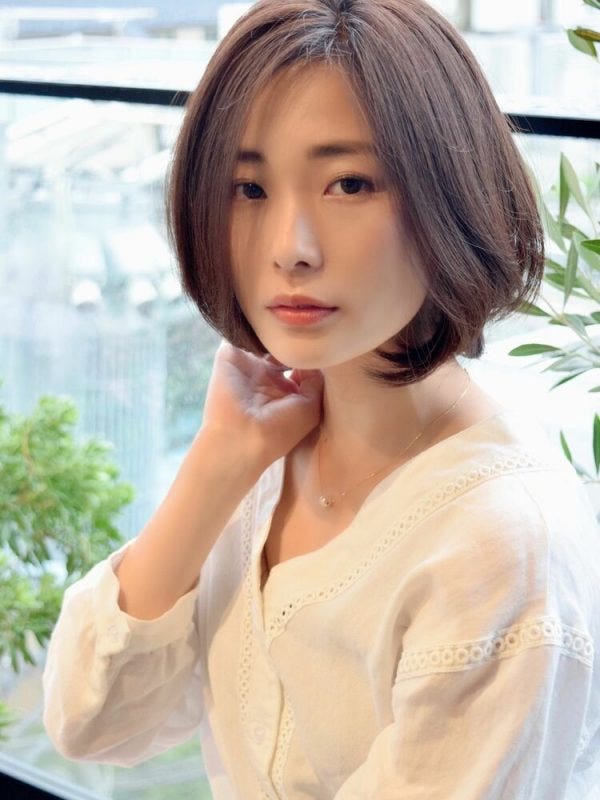 暗髪の前髪なしボブは40代の大人女性にも似合いやすく、オフィス使いにもおすすめの髪型ですよ。