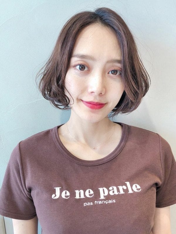 前髪なしですっきりとしていて落ち着いた印象ですが、毛先にパーマをかけることによって華やかさがアップして地味な印象にはなりません。