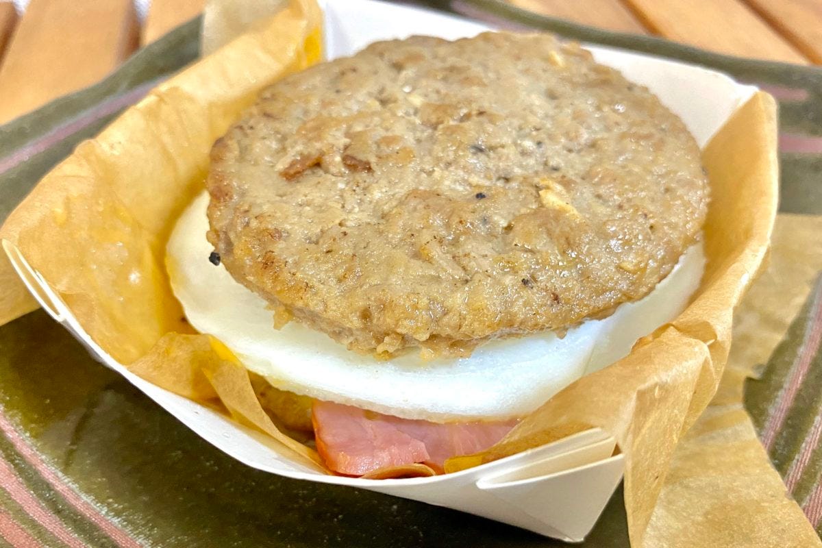 肉は弱めの味付けでさらっとしています。ジューシーさというよりは、脇役のパンの代わりをつとめている印象でした。味の主役は、中身のベーコン・目玉焼き・チーズです。