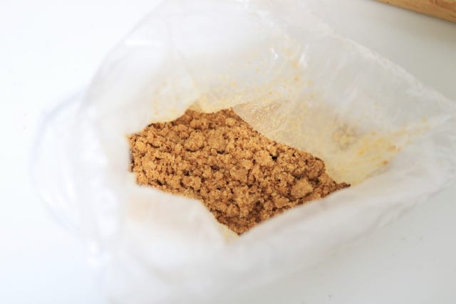 ① ポリ袋にビスケットを入れ、麺棒で叩いて細かくなるまで砕く。レンジで無塩バターを溶かし、ビスケットの袋に入れてよくなじませる。