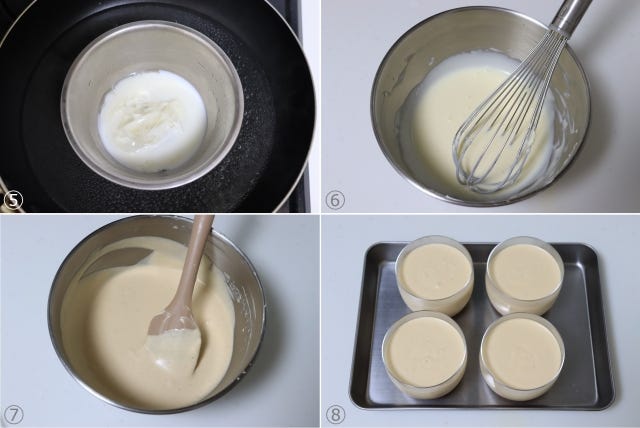 ⑤ 別のボウルに牛乳と氷水で戻した板ゼラチンを入れ、湯せんで溶かす。