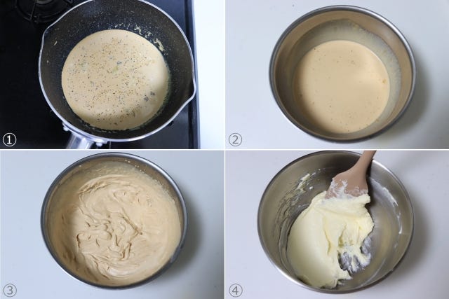 ⑥ ⑤を④のボウルに2回に分けて加え、ホイッパーでダマが残らないようにしっかり混ぜる。