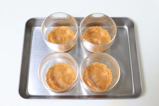 ② お好みのカップに4等分にして入れ、ギュッと押して敷き詰めたら、冷蔵庫で冷やしておく。