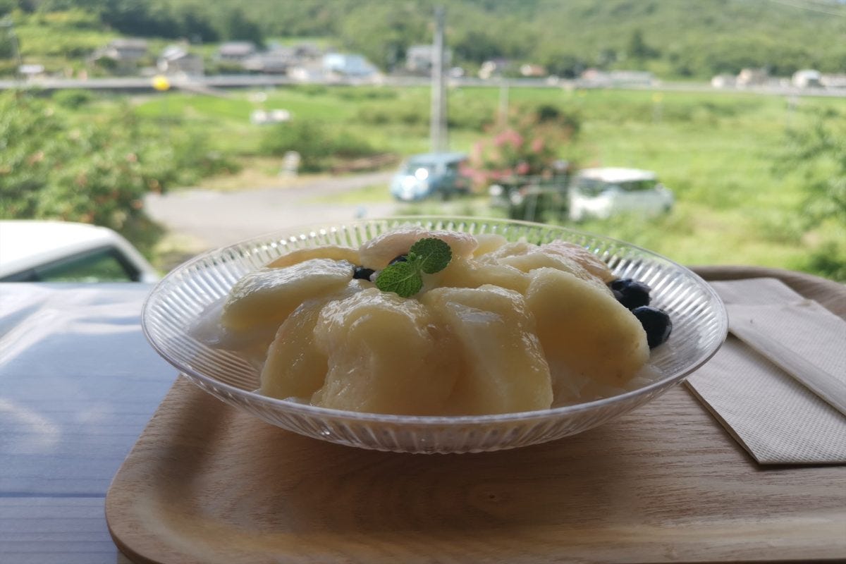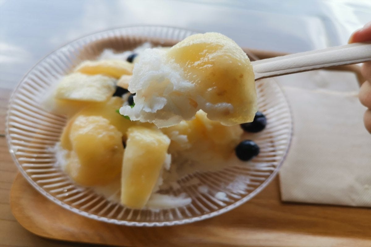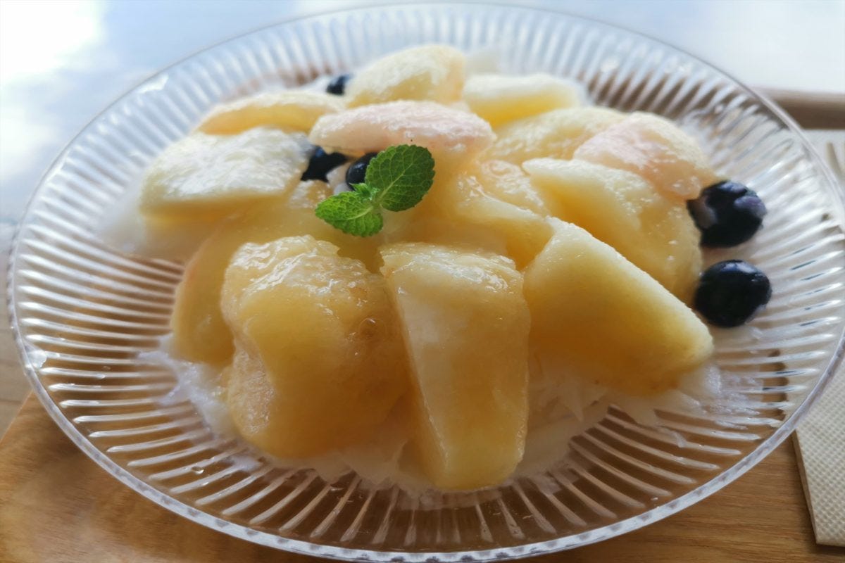 かき氷には農園で収穫された桃とブルーベリーが、ミルク味の氷の上に盛られている。桃だけでかなり贅沢な量が使われており、これだけでフルーツ好きにはたまらない見た目だ。