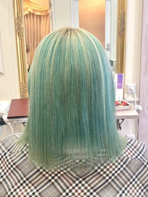 爽やかな夏にぴったりのミントグリーンを内側に、表面にハイライトのようにブロンドカラーを入れたアンブレラカラーは髪に立体感を出せるヘアスタイルですね。