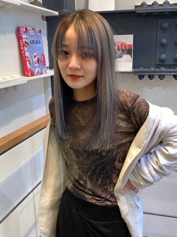 表面全体ではなく束になるよう透明感のあるカラーを入れているので、インナーのブリーチなしの黒髪のハイライトのようにも見えますね。