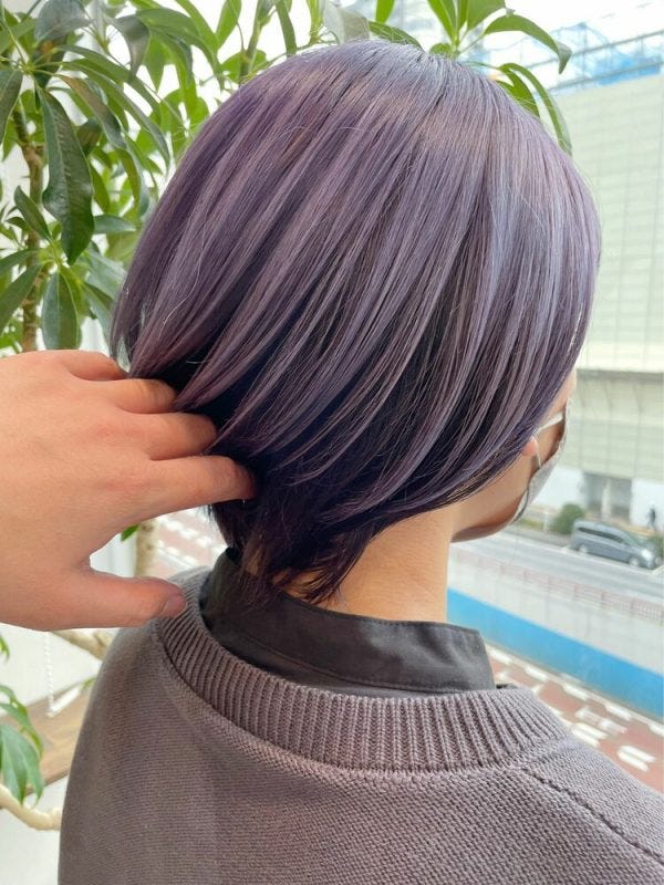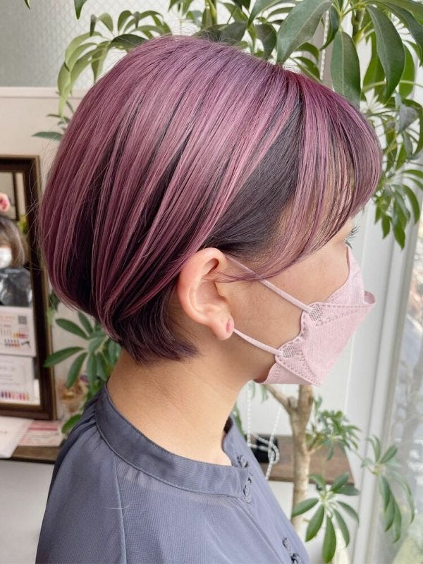 ツヤ感のあるバイオレットカラーからインナーの黒髪が透けて見えると、ボブの髪色に深みが出ますね。