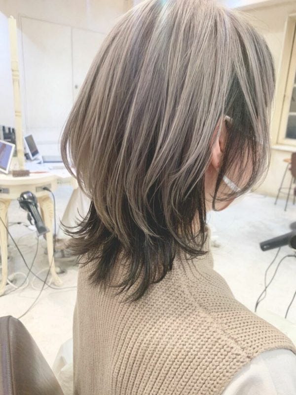 透明感のある人気のアッシュグレーからインナーの黒髪が透けることでワンカラ―のアッシュグレーよりも深みが出て、大人女性にも合わせやすいヘアスタイルになっています。