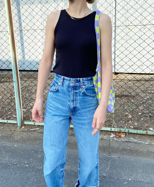 このデニムパンツは、とにかく脚をすっきりと長く見せてくれる、形の美しさが魅力。