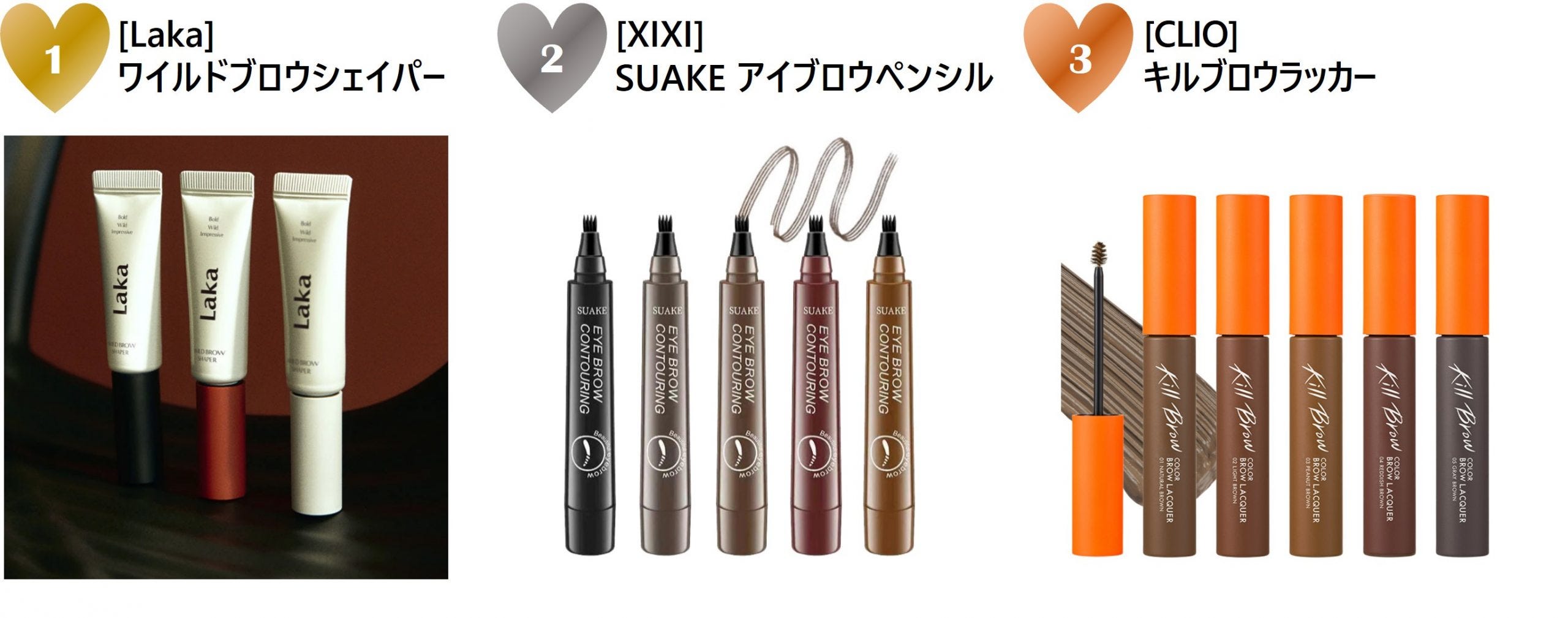 1位には、眉毛の流れとボリュームに躍動感を与える[Laka]ワイルドブロウシェイパーがランクイン。時間が経っても整えた眉のシェイプを強力に保ち、美しい眉をキープできるアイテムです。