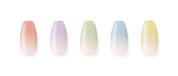 数あるデザインラインナップの中から、指先に行くほどスリムで立体的にデザインされたロンタイプをご紹介。写真の「N Fruit」は、甘くキュートな印象でパステルカラーが美しいグラデーションネイル。カジュアルからフェミニンまで、幅広い着こなしにマッチしますよ。