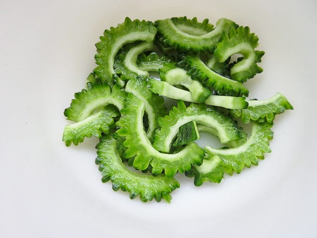 ① ゴーヤは縦半分に切り、種とわたをとり、5mm厚さに切ります。