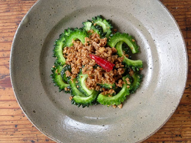 ゴーヤの甘辛豚そぼろかけ