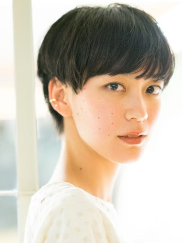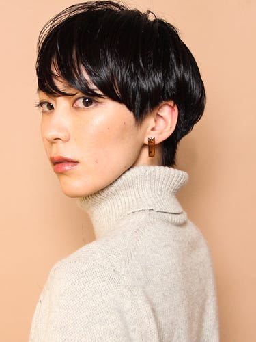 ふんわりとしたボリューム感で、黒髪のハンサムショートでも柔らかさを感じる髪型です。