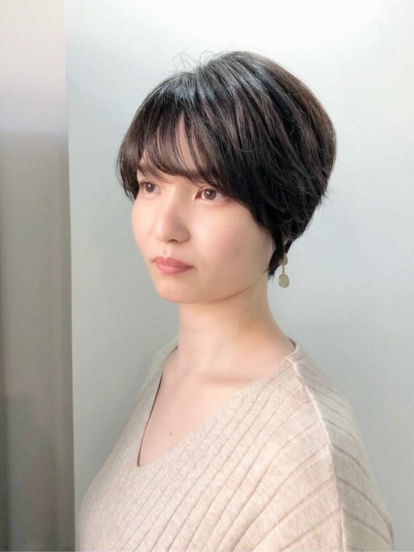前髪はうっすらとおでこが透けるぐらいの軽めの量にしつつ、ふんわりと動きをつけてあげることで大人女性にも似合う可愛い前髪ありの黒髪ハンサムショートになります。