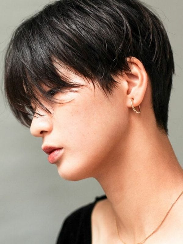 長めの前髪ありの黒髪ハンサムショートの場合は、分け目を作って前髪をさらりと流してあげるとおでこが見える範囲が広がり明るい印象となります。