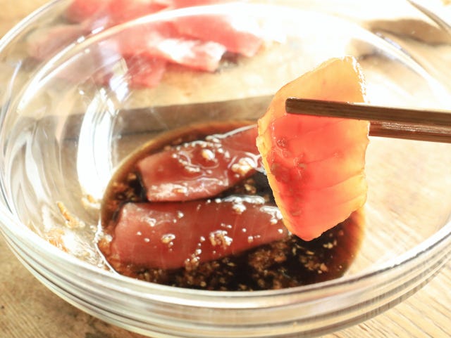 ④ どんぶりまたは器にご飯を盛り、②のマグロを乗せる。残っている汁の適量を回しかける。
