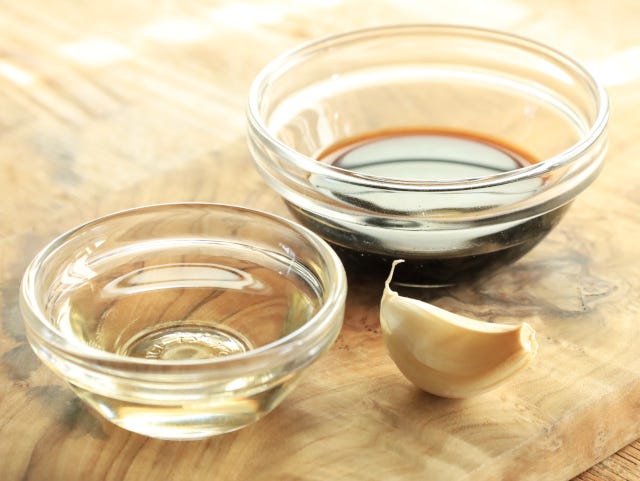 ① ボウルに、にんにくをすりおろし、しょう油と本みりんを加える。