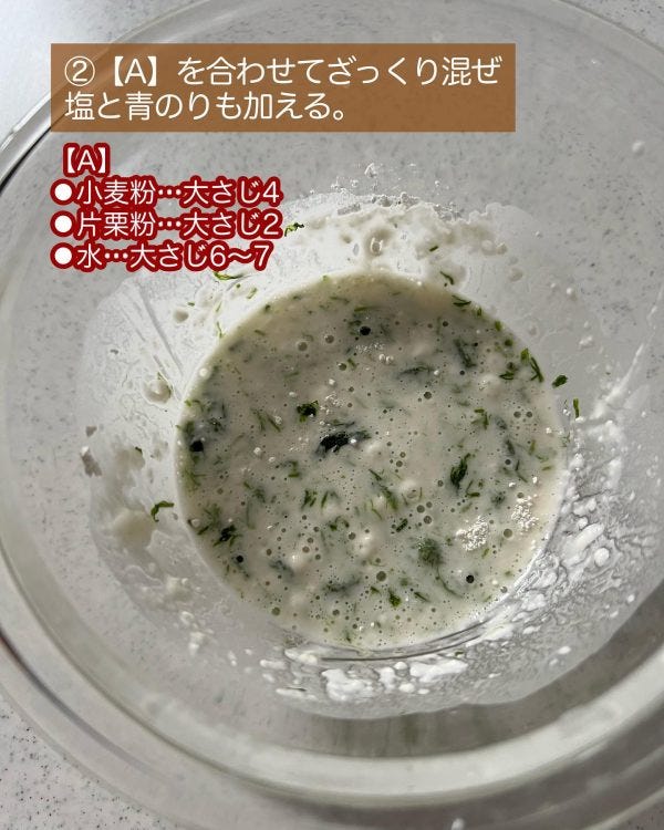 Aを合わせてざっくり混ぜ、塩と青のりも加える。