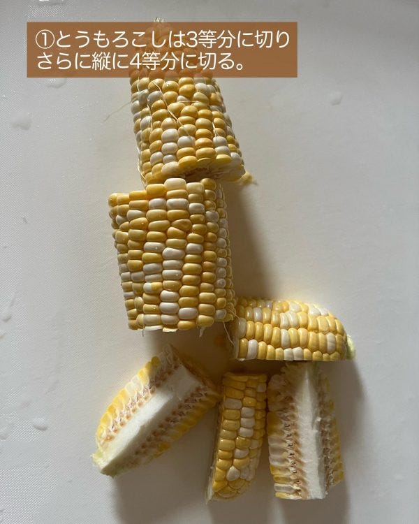とうもろこしは3等分に切り、さらに縦に4等分に切る。
