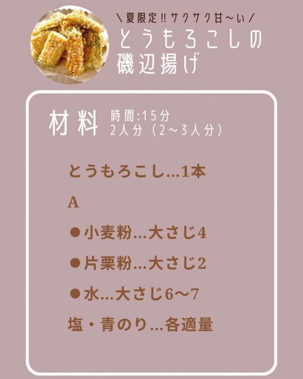 今回は「とうもろこしの磯辺揚げ」をご紹介します。
