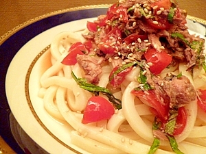 トマトの酸味や大葉の香りがサバ缶と見事にマッチした冷しうどんです。