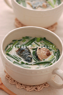 博多万能ねぎとさば水煮缶の豆乳味噌スープ
