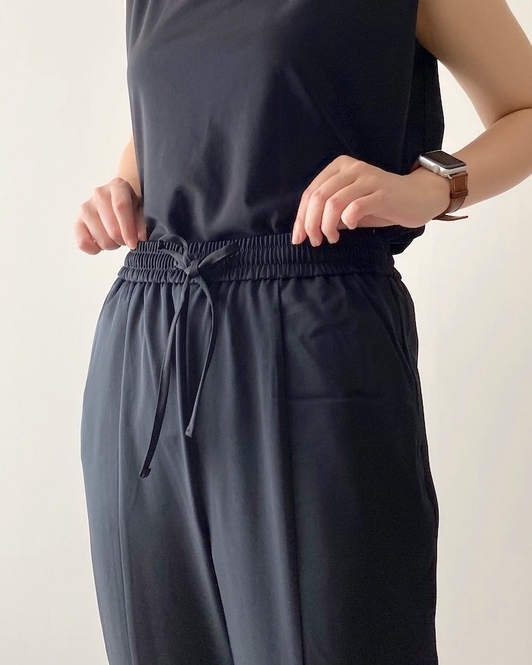 太もも周りはゆとりがあり、裾に向かって絞られたジョガーパンツ。