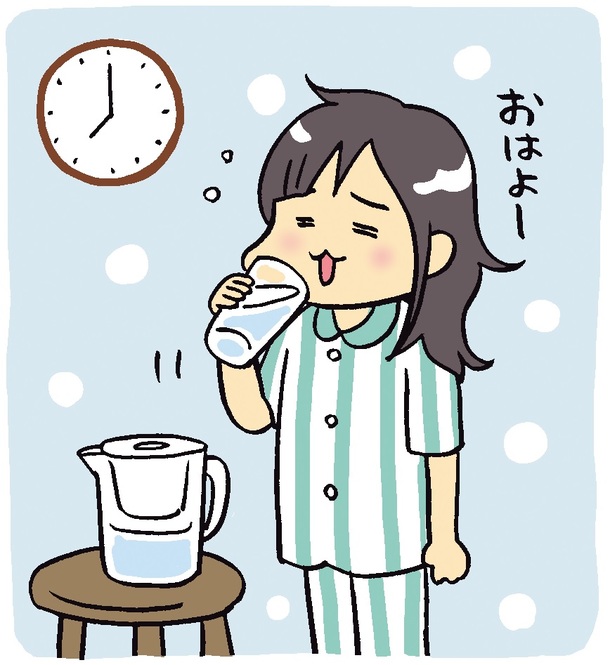 食べ物や飲み物を摂取すると、胃と結腸に反射を起こし、腸に刺激を与えられる。この反応を利用するため、朝起きたらすぐに水を飲むこと。「この反射が一番強く起きるのが朝。朝食を摂るのがベストですが、コップ1杯の水でもこの反射を起こせます。特に夏は、寝ている間に水分を失った体に冷たい水を入れてあげることで、胃腸にスイッチが入りやすくなる。冷水の方が素早く吸収されますが、腸へ負担をかけたくないなら白湯(さゆ)などの温かい飲み物でもOK」(工藤さん)