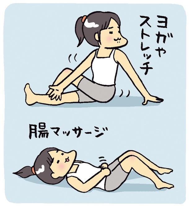 腸の蠕動運動を活性化させるためには、適度な刺激を加えるのが効果的。「交感神経が優位になると蠕動運動が停滞するので、運動するなら激しい運動ではなく、ウォーキングやヨガ、ストレッチなどにしましょう。特に夜は副交感神経が優位になるようにリラックスできることを取り入れるとよいです。例えばひざを立てて仰向けになり、大腸の流れに沿ってマッサージしたり、お腹を触るだけでもOK。寝る前に行えば、翌日のスムーズな排便にもつながります」