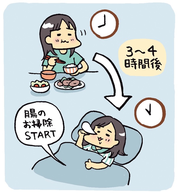 「胃が食べ物を消化するのに3~4時間かかるといわれています。そのため食後すぐに寝ると、胃が消化不良を起こし、胃腸の働きが低下してしまいます。夕食は、就寝3~4時間前に食べ終わっているのが理想的です」。消化が一段落すると、散らかった腸内のお掃除タイムが始まる。これをMMC(伝播性消化管収縮運動)といい、就寝中に、殺菌性のある消化液で消化物や悪玉菌を処理。善玉菌の働きを良くしてくれるので、腸内環境が整い、美腸に導いてくれる!