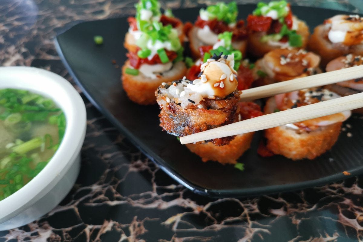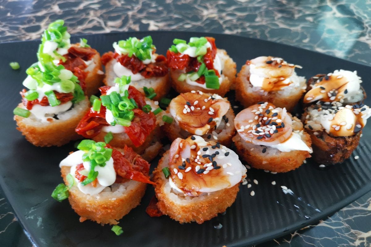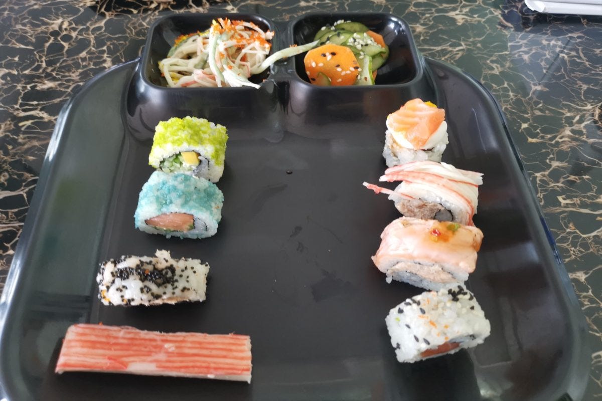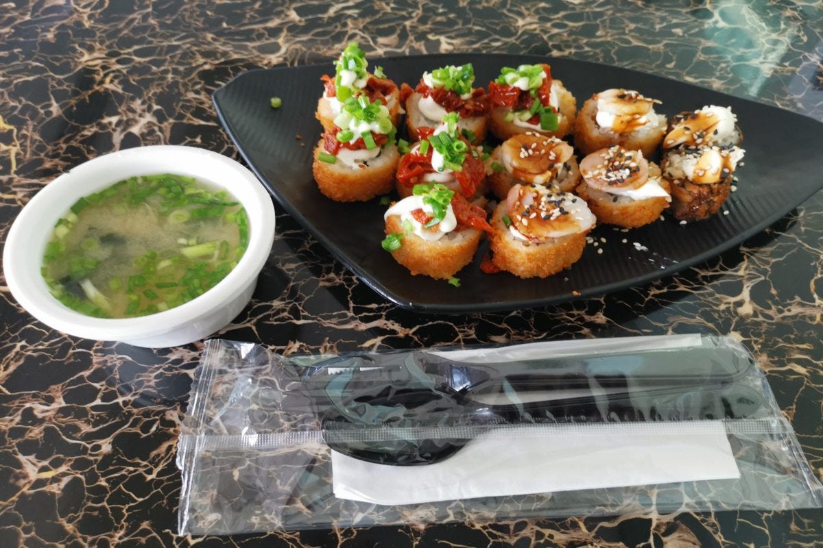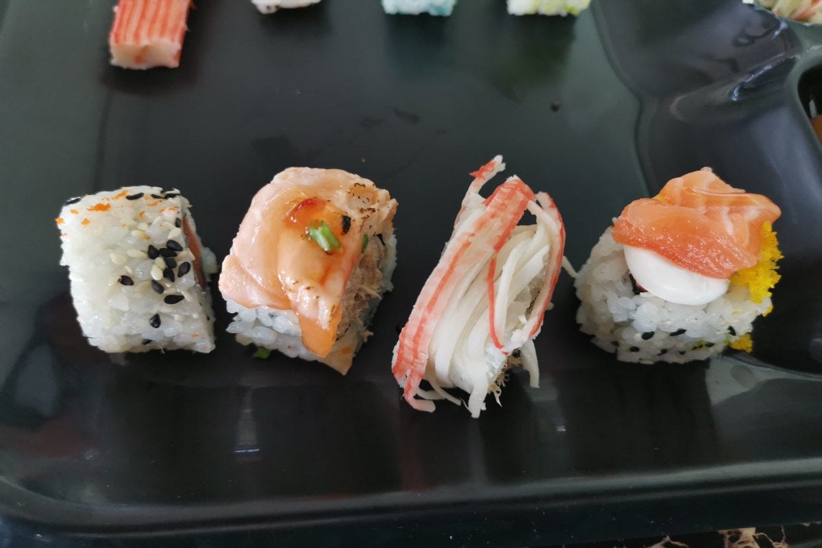 まあ物価が日本より高めのドバイだから仕方がないか...と思いつつも、どうも食欲が沸かない。しかし店員いわく「これはブラジル風の寿司でめっちゃ美味しい」とのことなので、勇気を出して食べてみることに。