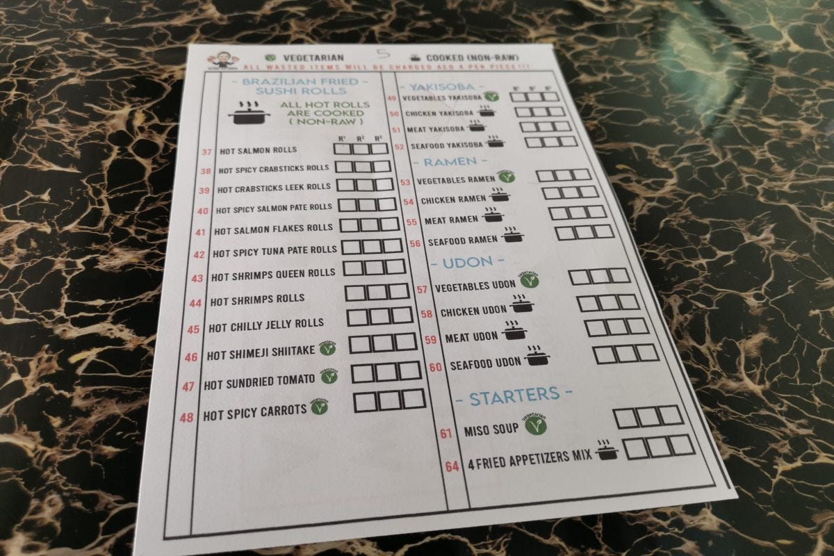まず最初の注文はこちらの用紙に記入するのだが、日本人がイメージする寿司はひとつもない。寿司食べ放題でラーメンやうどんを注文するのもアレなので、まずは店員お勧めの「ホットサンドライトマト」と、「ホットシュリンプクイーンロール」を注文。