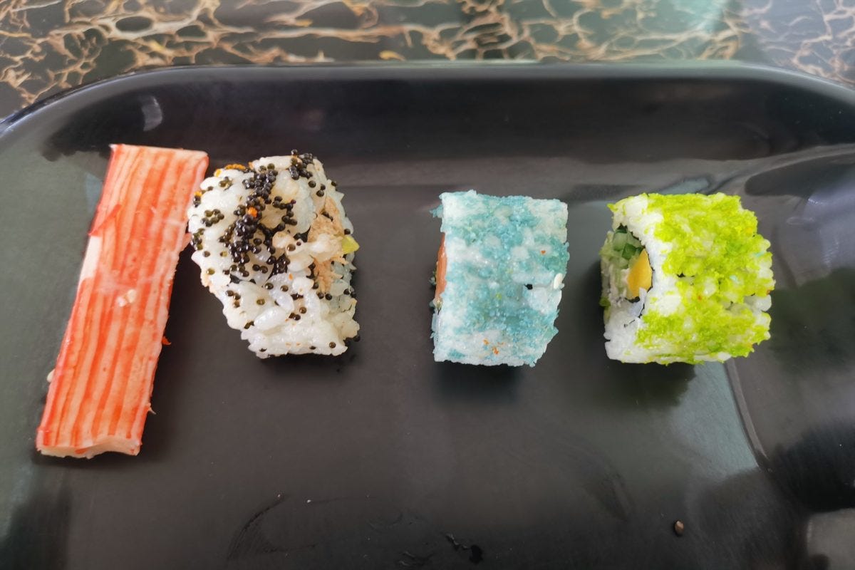 気になる味だが、とびっこはほぼ味がないため醤油をガッツリつけてぎりぎり食べられる程度。当然酢飯はカチカチである。カニカマも見た目はカニカマだが、「日本のカニカマって超ウマいんだな...」と認識できる味。
