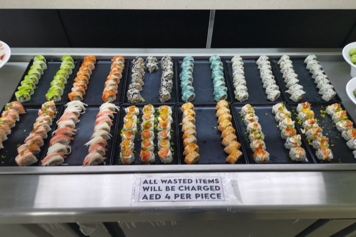 しかし、カニカマの寿司などまだ食べられそうなものもあったので、勇気を出し8個ほど取る。お残しは1つにつき4UAEディルハム取られるので、かなりの覚悟がいる決断だった。