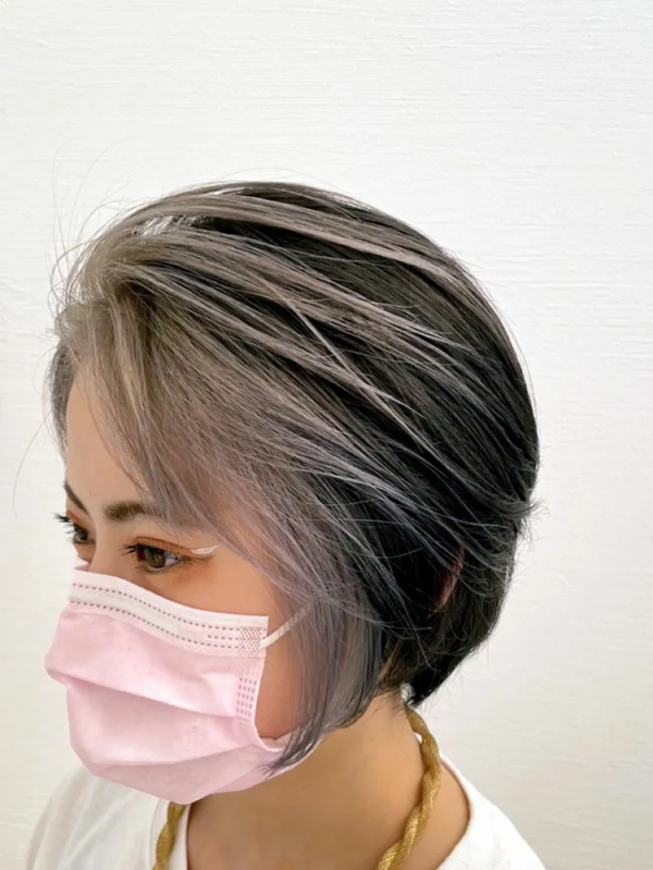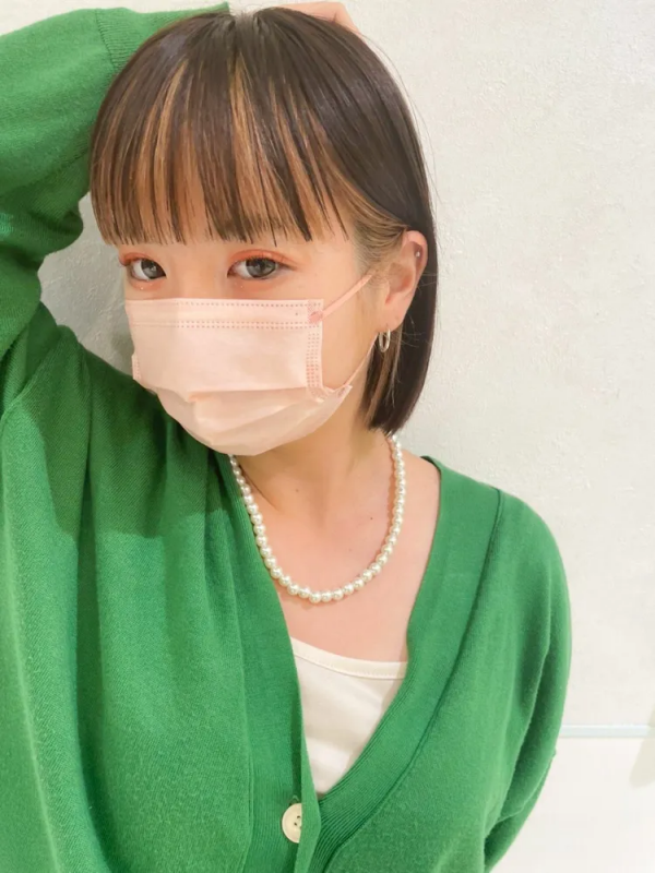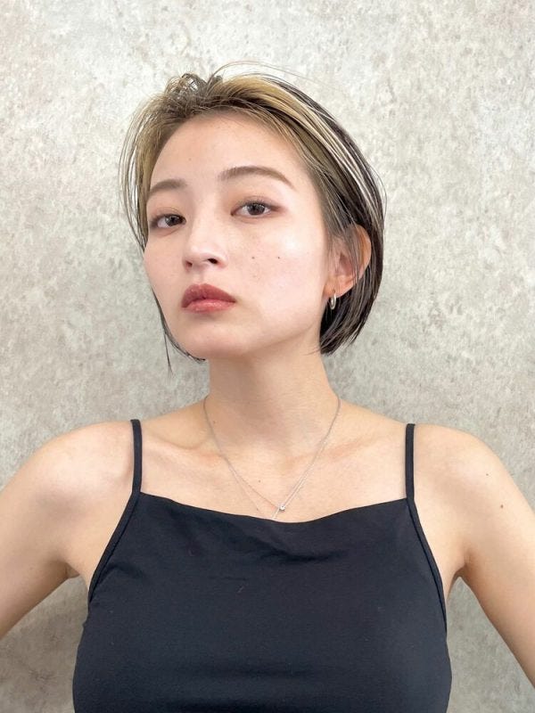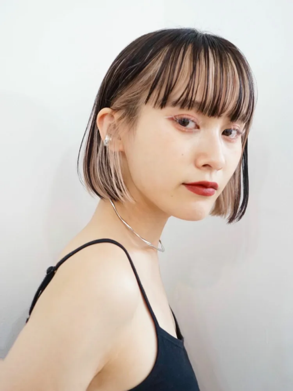 前髪なしのボブなら伸ばした前髪部分だけをブリーチしてバングカラーを入れることで、顔周りを明るくするフェイスフレーミングカラーが作れますよ。