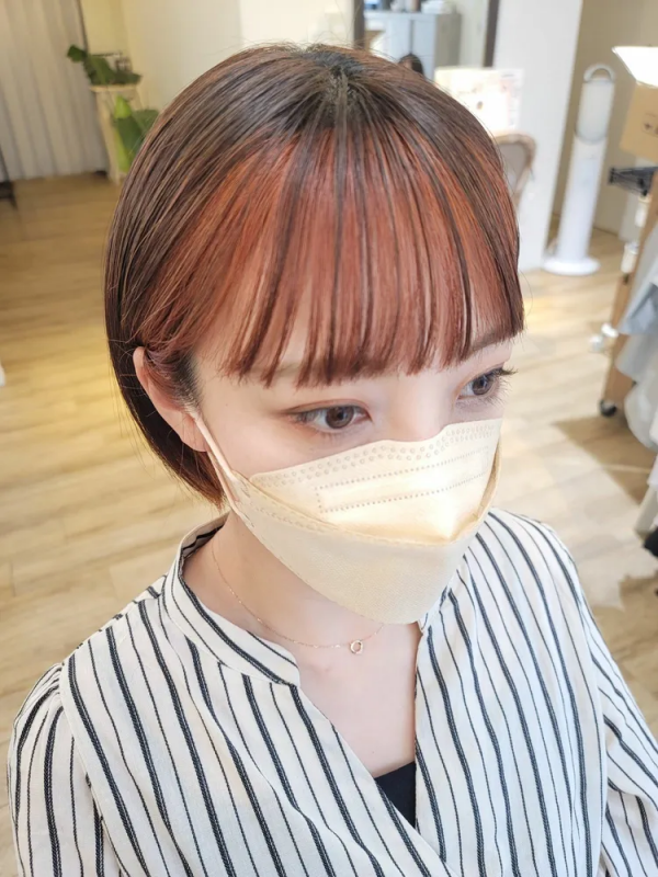 シンプルシルエットのショートボブの前髪部分をブリーチして、オレンジ系のヘアカラーを入れたバングカラーです。